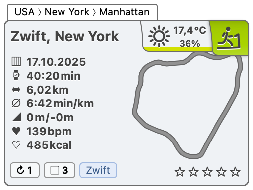 Laufen in Zwift, New York am 17.10.2025 Veröffentlicht am Freitag, 17. Oktober 2025Freitag, 17. Oktober 2025 von Volker Schering Laufen in Zwift, New York am 17.10.2025 Weiterlesen