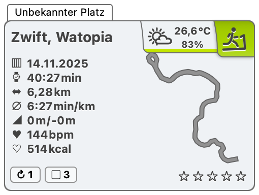 Laufen in Zwift, Watopia am 14.11.2025 Veröffentlicht am Freitag, 14. November 2025Freitag, 14. November 2025 von Volker Schering Laufen in Zwift, Watopia am 14.11.2025 Weiterlesen