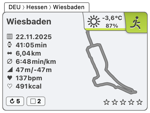 Laufen in Wiesbaden am 22.11.2025 Veröffentlicht am Samstag, 22. November 2025Sonntag, 23. November 2025 von Volker Schering Laufen in Wiesbaden am 22.11.2025 Weiterlesen