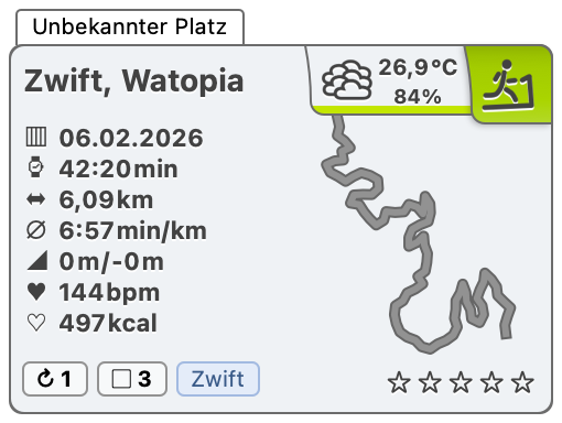 Laufen in Zwift, Watopia am 06.02.2026 Veröffentlicht am Freitag, 06. Februar 2026 von Volker Schering Laufen in Zwift, Watopia am 06.02.2026 Weiterlesen