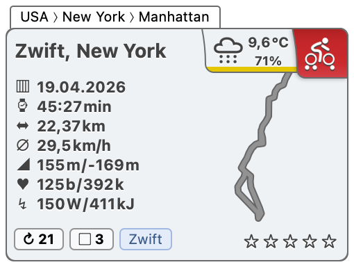 Radfahren in Zwift, New York am 19.04.2026 Veröffentlicht am Sonntag, 19. April 2026 von Volker Schering Radfahren in Zwift, New York am 19.04.2026 Weiterlesen