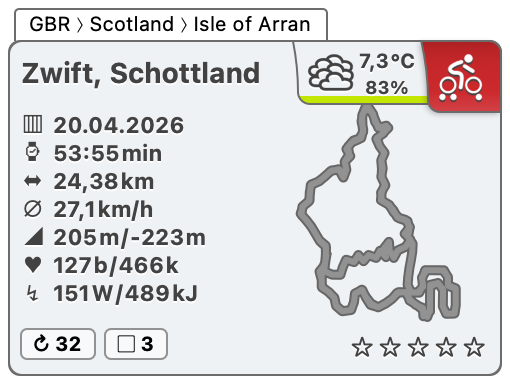 Radfahren in Zwift, Schottland am 20.04.2026 Veröffentlicht am Montag, 20. April 2026 von Volker Schering Radfahren in Zwift, Schottland am 20.04.2026 Weiterlesen